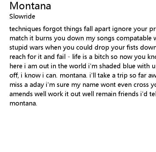 techniques forgot things fall apart ignore your problems long enough just like a match it burns you down my songs compatable with yours but still you fight your stupid wars when you could drop your fists down just out of reach but still i reach for it and fail - life is a bitch so now you know why i'm so bitter so here i am out in the world i'm shaded blue with undertones of grey i'll shake it off, i know i can. montana. i'll take a trip so far away youll never know wont miss a aday i'm sure my name wont even cross your mind then well pretend to make amends well work it out well remain friends i'd tell you what but you wont hear. montana. |
