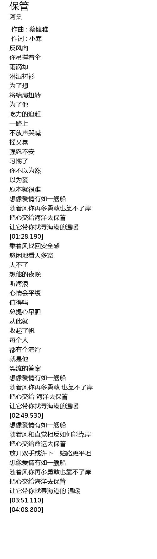 | [01:16.020] | ba xin jiao gei hai yang qu bao guan |