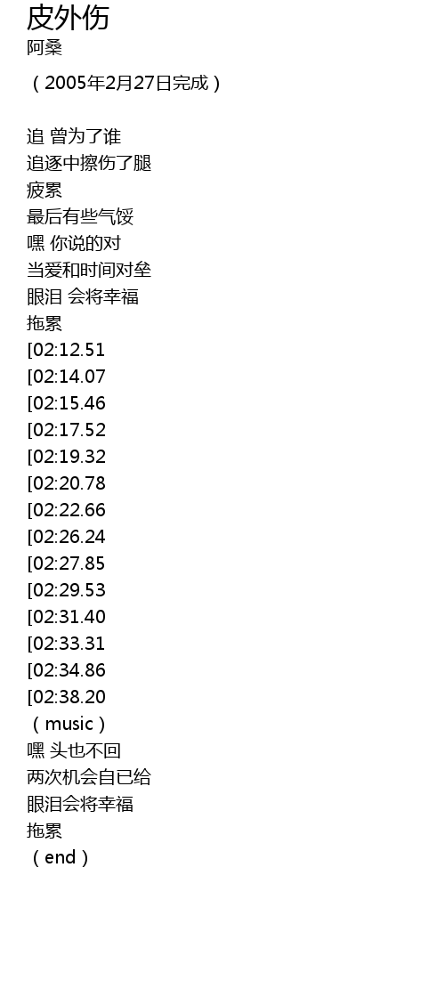 | [03:10.33][02:12.51][01:00.37] | 是皮外伤 |