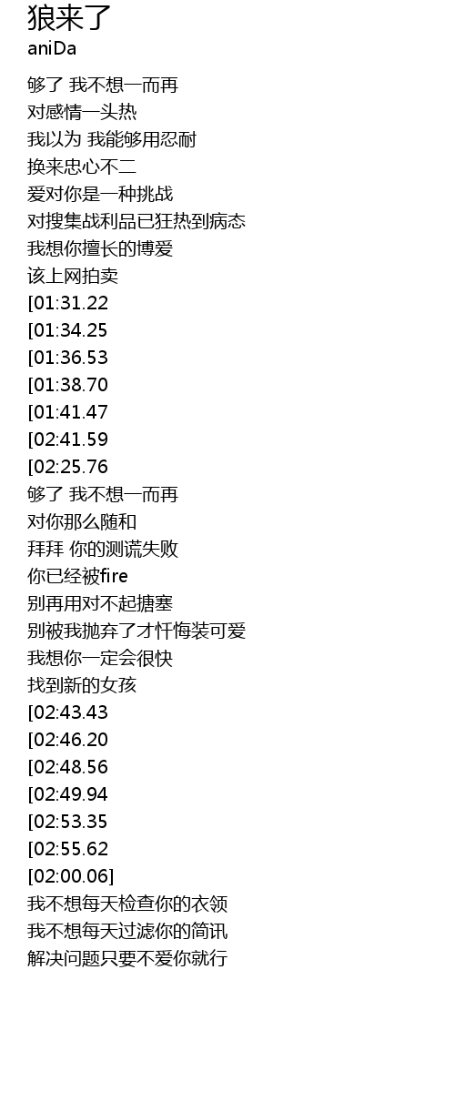 | [03:00.45][01:34.25][00:50.77] | 你说狼来了狼来了 |