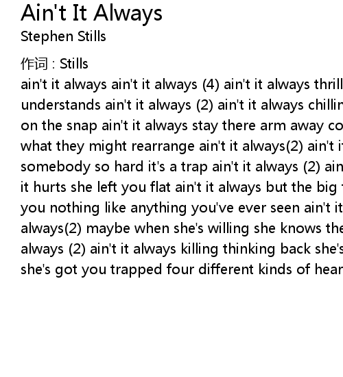| ain't it always ain't it always (4) ain't it always thrilling to find a lover understands ain't it always (2) ain't it always chilling that you might lose her on the snap ain't it always stay there arm away cos people change never know what they might rearrange ain't it always(2) ain't it always trouble love somebody so hard it's a trap ain't it always (2) ain't it always double how much it hurts she left you flat ain't it always but the big thing was how she loved you nothing like anything you've ever seen ain't it always (2) ain't it always(2) maybe when she's willing she knows the way she'll come back ain't it always (2) ain't it always killing thinking back she's all of that for that girl she's got you trapped four different kinds of heart attack ain't it always (4) |