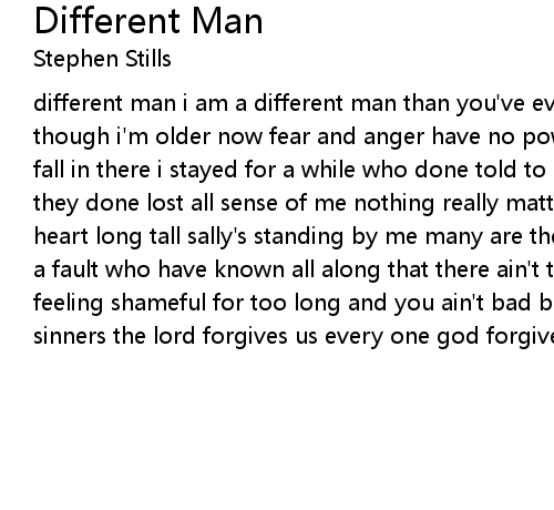 different man i am a different man than you've ever seen me be i got young though i'm older now fear and anger have no power over me dug a hole and i did fall in there i stayed for a while who done told to be my saviour in their pity they done lost all sense of me nothing really matters but the love that's in my heart long tall sally's standing by me many are the friends i have been loyal to a fault who have known all along that there ain't too much good we've done feeling shameful for too long and you ain't bad but you went wrong we all are sinners the lord forgives us every one god forgive every one |