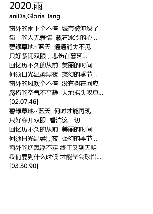 | [00:45.21] | 窗外的雨下个不停 城市被淹没了 |