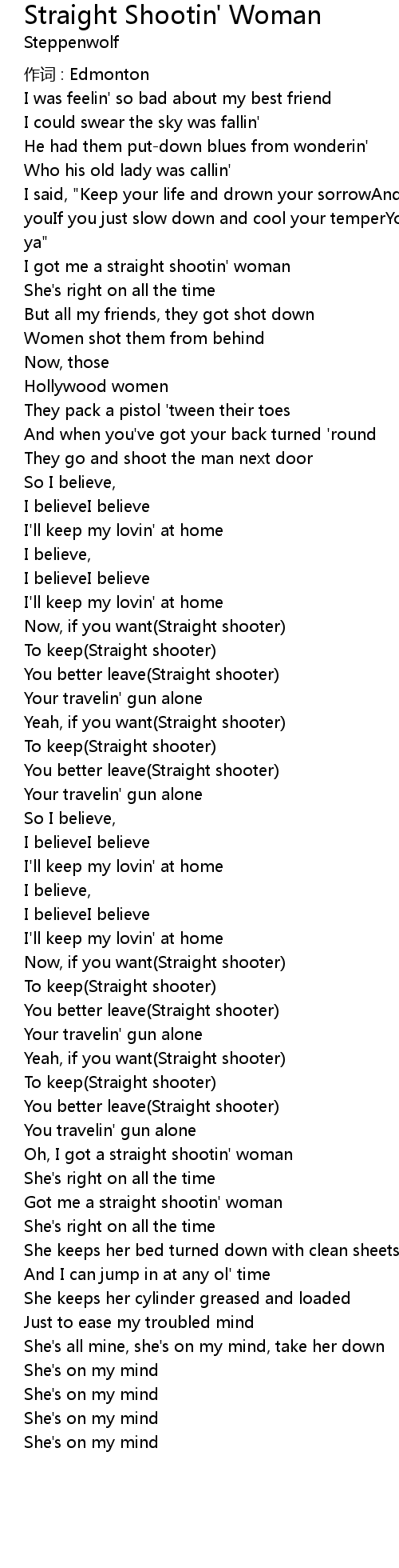 | Oh, I got a straight shootin' woman | |