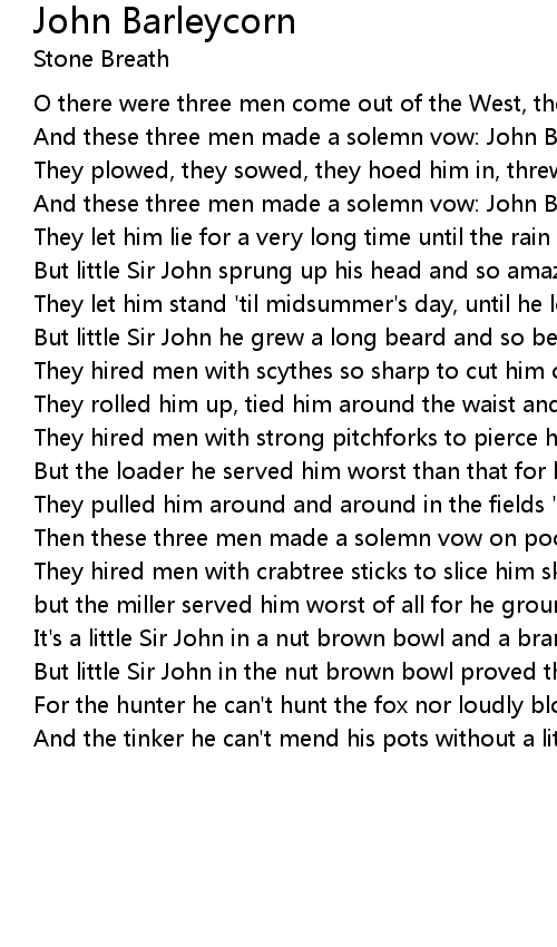 And the tinker he can't mend his pots without a little Sir Barleycorn |