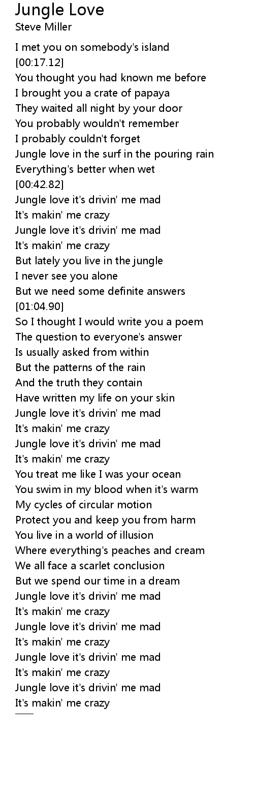 | [02:28.69] | Jungle love it's drivin' me mad |