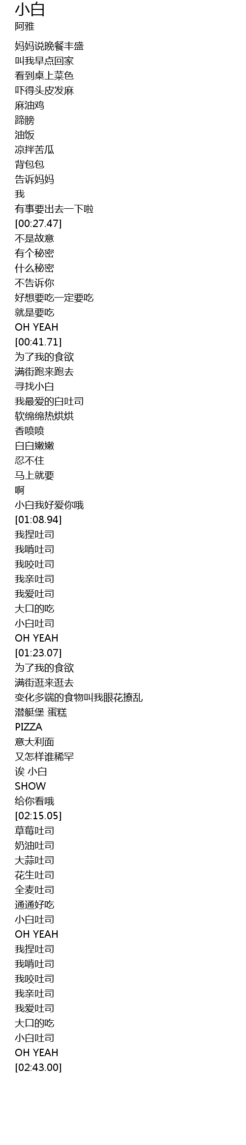 | [00:57.84] | xún zhǎo xiǎo bái |