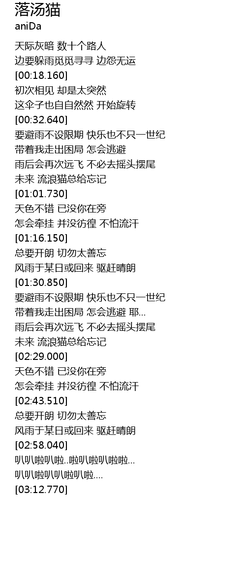 | [02:23.160] | 未来 流浪猫总给忘记 |
