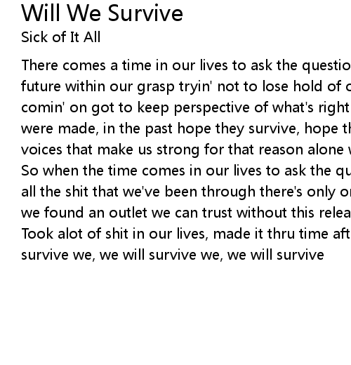 Took alot of shit in our lives, made it thru time after time i know we will survive we, we will survive we, we will survive |