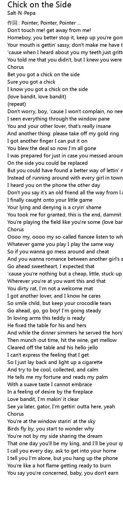 | I know you got a chick on the side | |