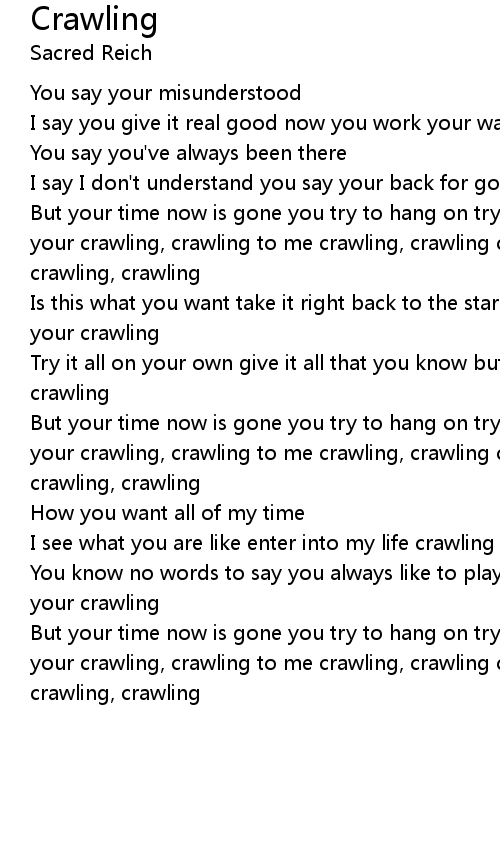 But your time now is gone you try to hang on try to stay on your feet but now your crawling, crawling to me crawling, crawling crawling, crawling back to me crawling, crawling |