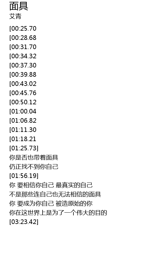 | [03:04.01] | 不是那些连自己也无法相信的面具 |