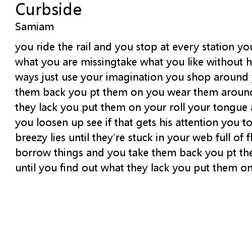 | you ride the rail and you stop at every station you want some of everyone to see what you are missingtake what you like without hesitation and to justify your ways just use your imagination you shop around you borrow things and you take them back you pt them on you wear them around awhile until you find out what they lack you put them on your roll your tongue and it sounds like conversation you loosen up see if that gets his attention you toss them around with all your breezy lies until they're stuck in your web full of flies you shop around you borrow things and you take them back you pt them on you wear them around awhile until you find out what they lack you put them on |