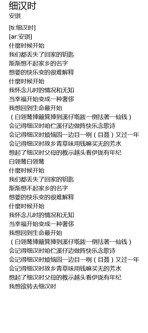 | [01:17.764] | 会记得细汉时故乡青草味用钱嘛买无的芳水 |