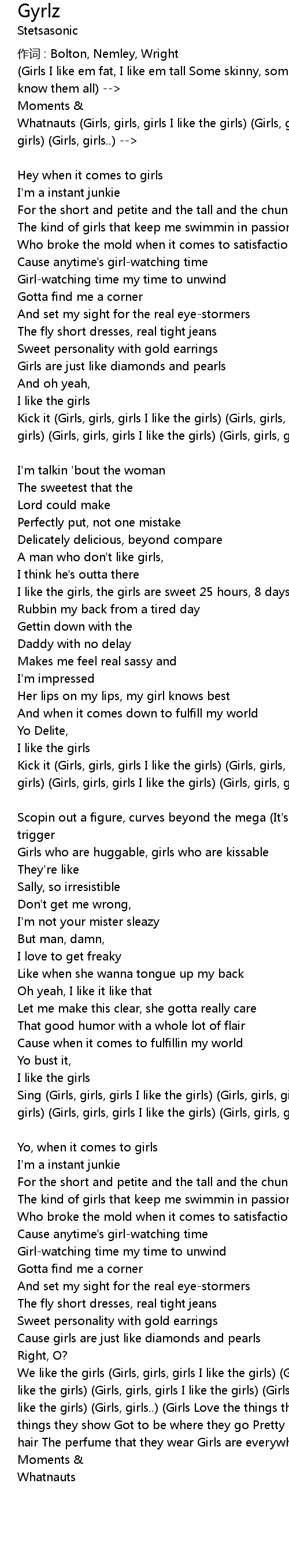 | Sing Girls, girls, girls I like the girls Girls, girls, girls I like the girls Girls, girls, girls I like the girls Girls, girls, girls I like the girls Girls, girls.. Delite | |