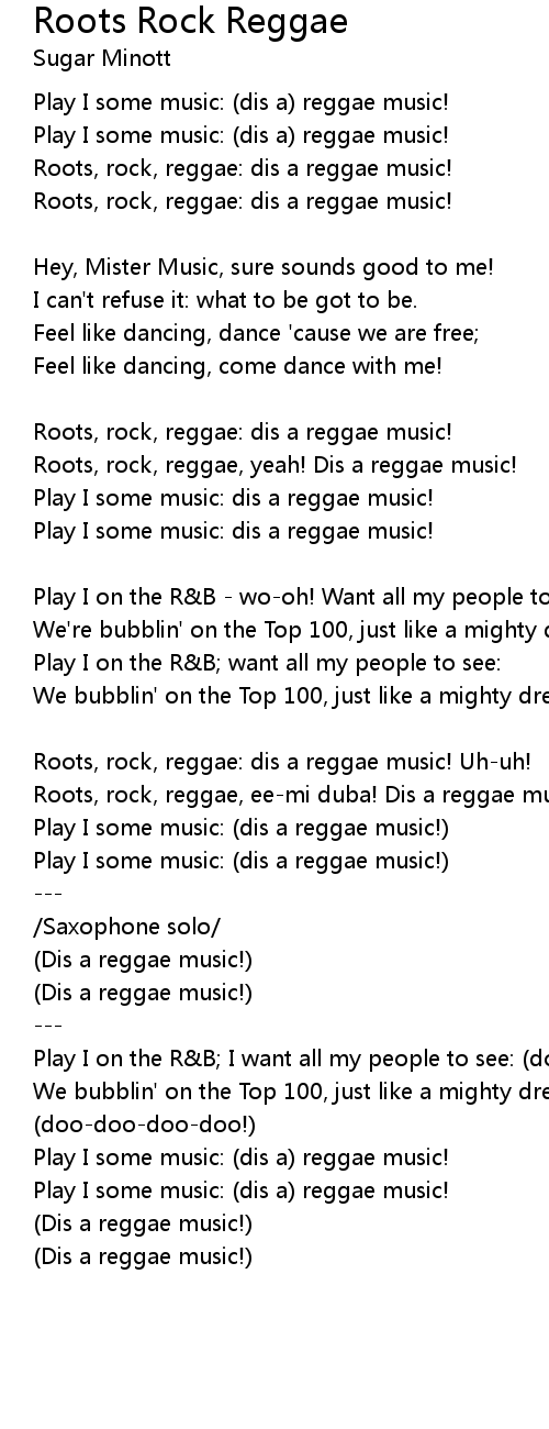 Roots, rock, reggae, yeah! Dis a reggae music! |