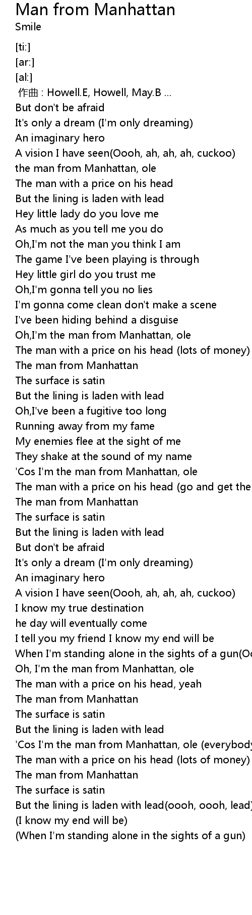 | [02:09.64] | 'Cos I'm the man from Manhattan, ole |
