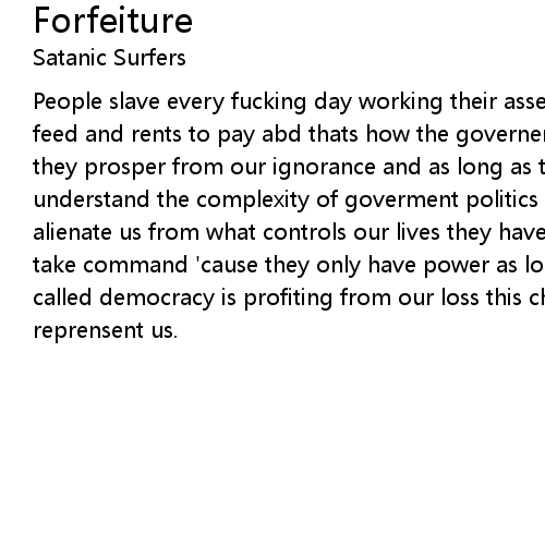 People slave every fucking day working their asses off 'cause there's mouths to feed and rents to pay abd thats how the governement wants things to stay 'cause they prosper from our ignorance and as long as the masses lack the ability to understand the complexity of goverment politics bureaucracy can be used to alienate us from what controls our lives they have us well in hand but we can take command 'cause they only have power as long as we let them this charade called democracy is profiting from our loss this charade called democracy no reprensent us. |