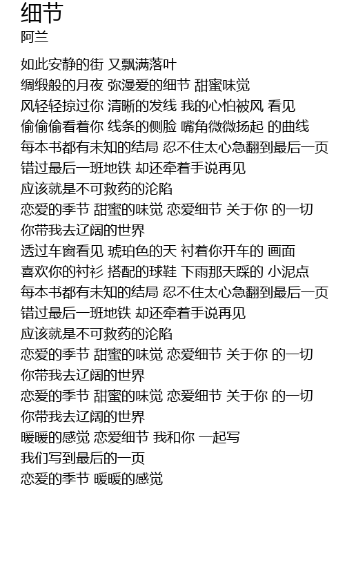 | [04:13.29] | 暖暖的感觉 恋爱细节 我和你 一起写 |