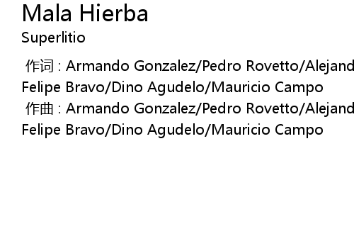 | [00:00.000] | 作词 : Armando Gonzalez/Pedro Rovetto/Alejandro Lozano/Andres Felipe Bravo/Dino Agudelo/Mauricio Campo |