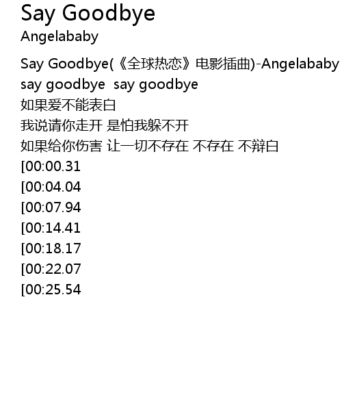 | [00:00.30] | Say Goodbye(《全球热恋》电影插曲)-Angelababy |