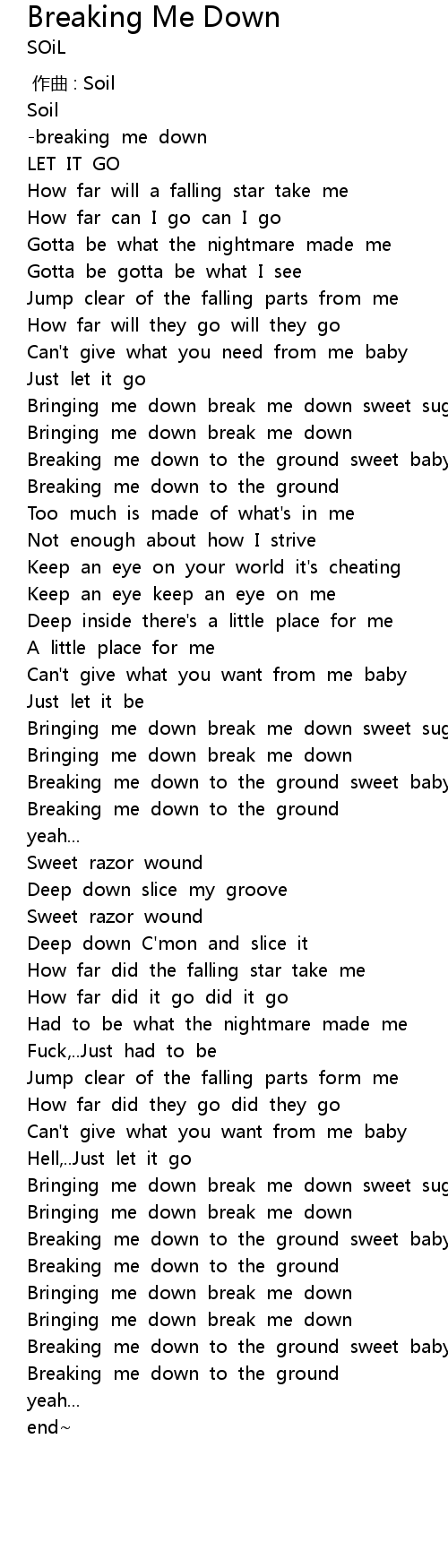 | [01:02.05] | Bringing me down break me down |