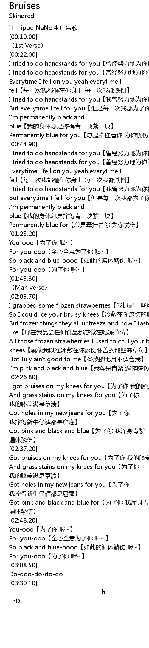 | [02:35.30] | Got pink and black and blue【为了你 我浑身青紫 遍体鳞伤】 |