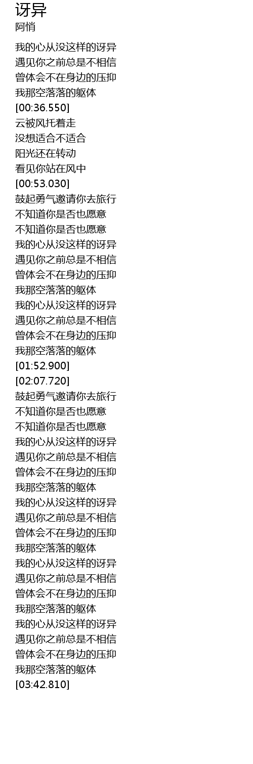 | [03:08.550] | wǒ de xīn cóng méi zhè yàng de yà yì |