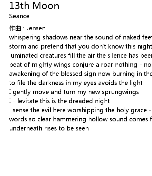 | whispering shadows near the sound of naked feet, followed by fear watch the storm and pretend that you don' t know this night will witness howly power flow luminated creatures fill the air the silence has been shattered everywhere the beat of mighty wings conjure a roar nothing nolonger as before 13th moon awakening of the blessed sign now burning in the sky the evil in the veins come to file the darkness in my eyes avoids the light | |