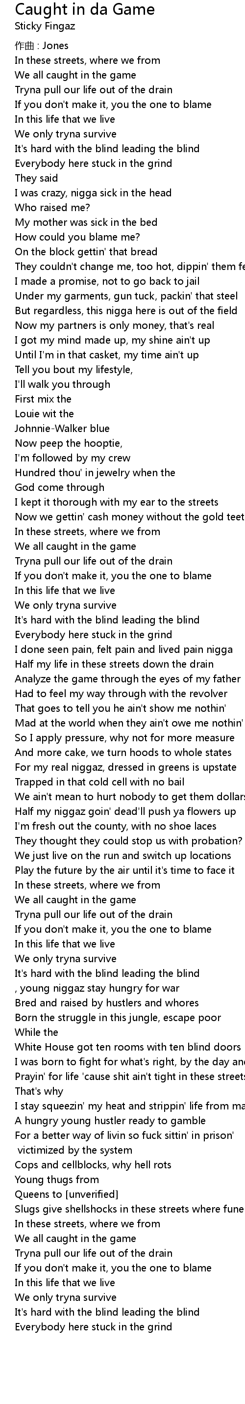 | Everybody here stuck in the grind[Unverified], young niggaz stay hungry for war | |