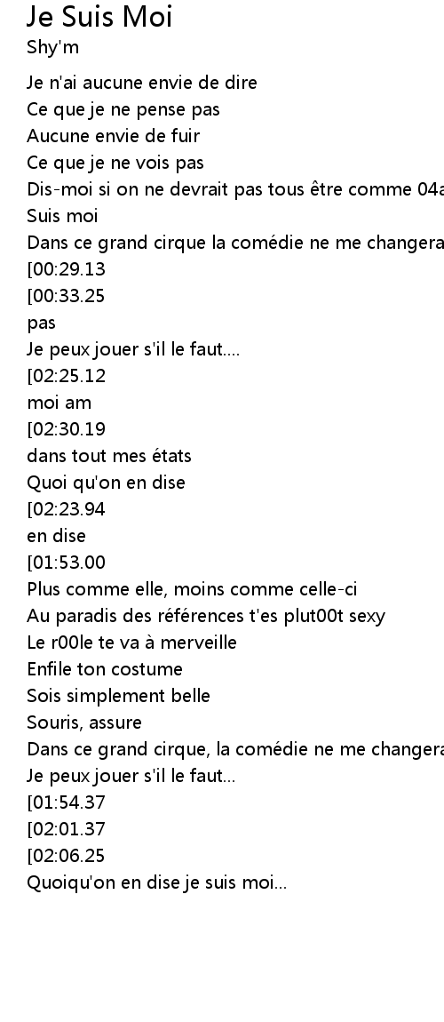 | [02:33.31][02:25.12][02:18.44][01:36.81][01:28.95][00:48.81][00:40.56] | Je suis moi am |