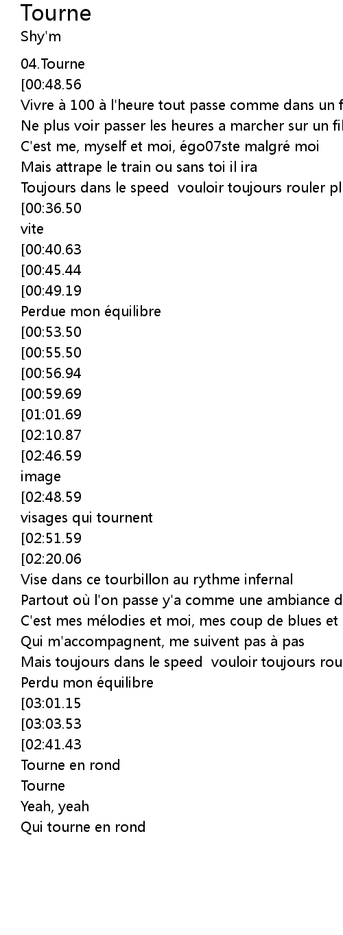 | [03:08.40][03:01.15][02:28.75] | Tourne , tourne je tourne |