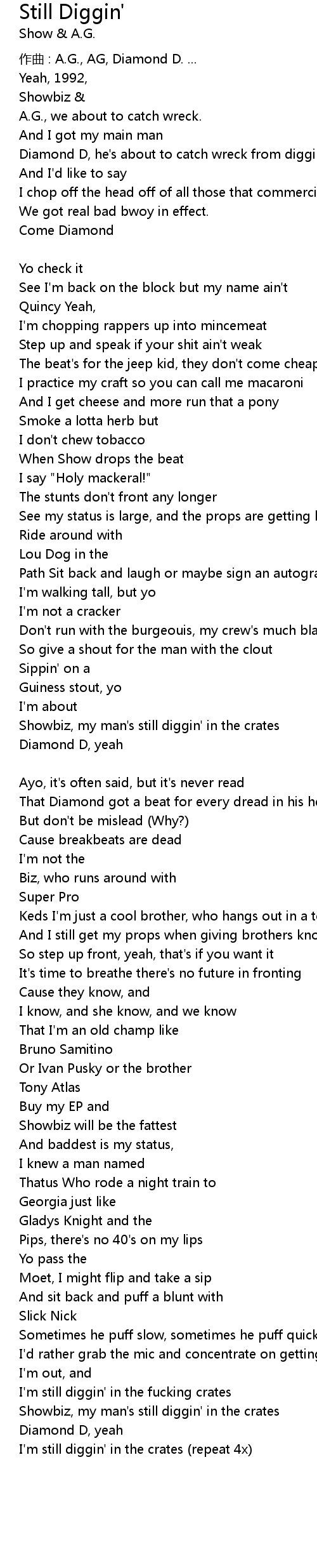 | I'm still diggin' in the crates (repeat 2x) [Showbiz] | |