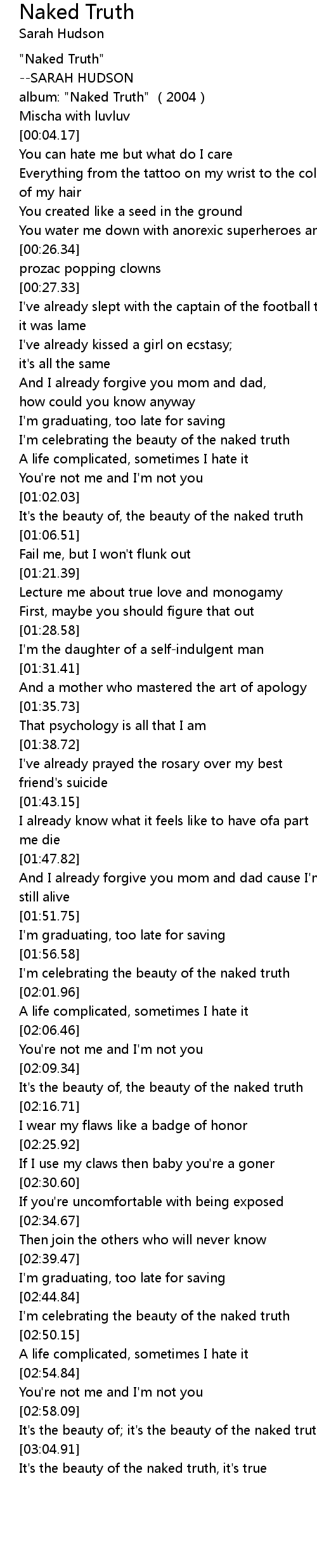 | [03:00.47] | It's the beauty of; it's the beauty of the naked truth |