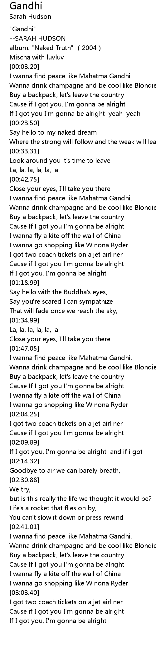 | [00:07.36] | I wanna find peace like Mahatma Gandhi |