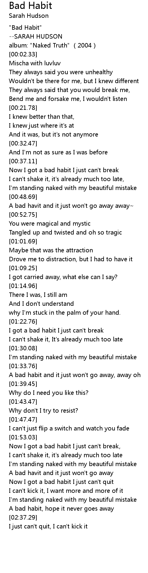 | [00:37.67] | Now I got a bad habit I just can' t break |