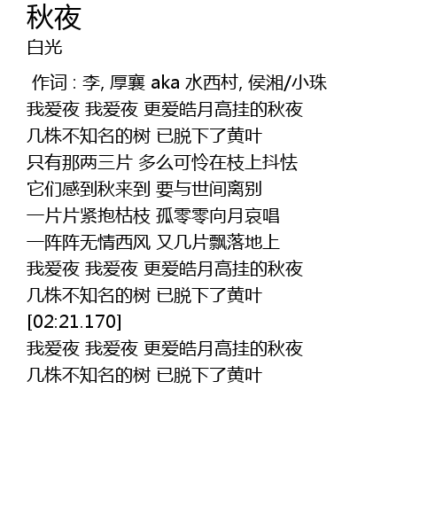 | [00:21.110] | wǒ ài yè wǒ ài yè gèng ài hào yuè gāo guà de qiū yè |