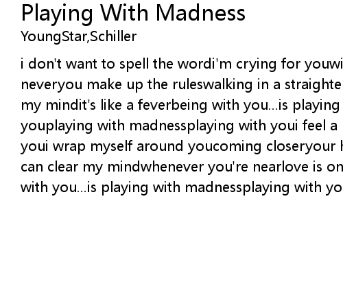 | i don't want to spell the wordi'm crying for youwill i have to loose it?now or neveryou make up the ruleswalking in a straighter linewherever you arelife is on my mindit's like a feverbeing with you...is playing with madnessplaying with youplaying with madnessplaying with youi feel a rush inside my veinsyearning for youi wrap myself around youcoming closeryour heart is my homethe sense of you can clear my mindwhenever you're nearlove is on my mindit's like a feverbeing with you...is playing with madnessplaying with you |