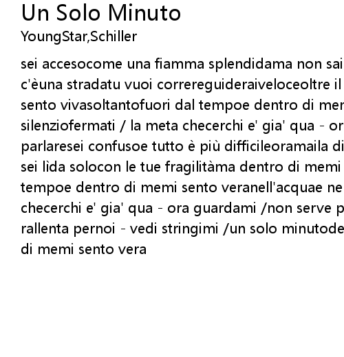 | sei accesocome una fiamma splendidama non saiche fare con la tua energiadove c'e una stradatu vuoi correreguideraiveloceoltre il limitema dentro di memi sento vivasoltantofuori dal tempoe dentro di memi sento veranell' acquae nel silenziofermati la meta checerchi e' gia' qua ora guardami non serve parlaresei confusoe tutto e piu difficileoramaila direzionee indefinibilee sei li da solocon le tue fragilita ma dentro di memi sento vivasoltantofuori dal tempoe dentro di memi sento veranell' acquae nel silenziofermati la meta checerchi e' gia' qua ora guardami non serve parlarefermati il mondo rallenta pernoi vedi stringimi un solo minutodentro di memi sento viva. dentro di memi sento vera |