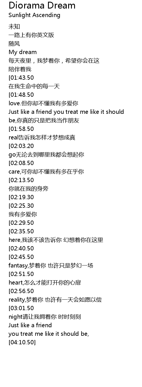 | [00:10.50][01:43.50] | I dream of you everyday of my life, mèng zhe nǐ zài wǒ shēng mìng zhòng de měi yì tiān |