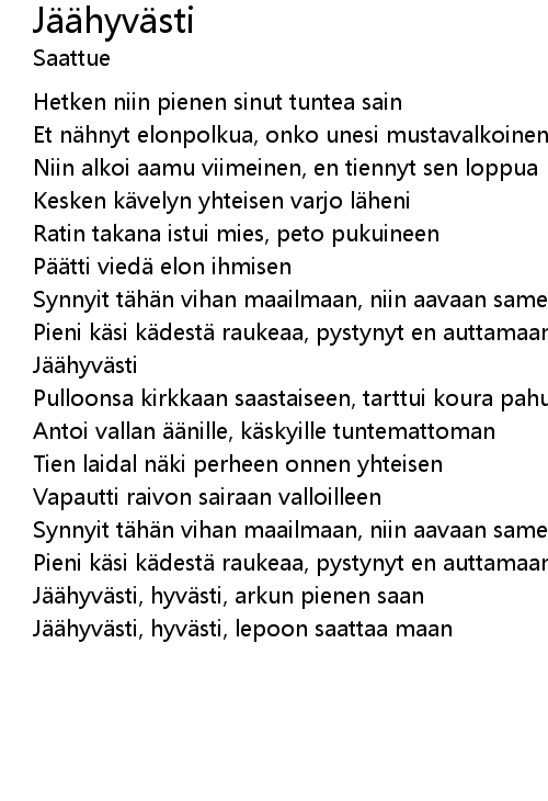 | Jäähyvästi, hyvästi, lepoon saattaa maan |