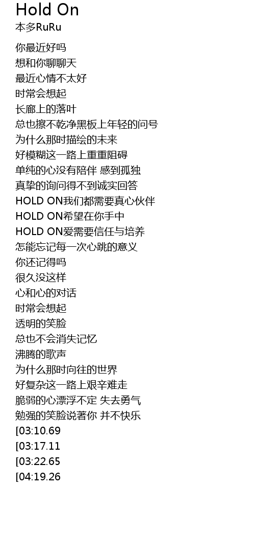 | [04:00.67][03:10.69][02:44.93] | HOLD ON yi ding hui zhao dao zhen xin huo ban |