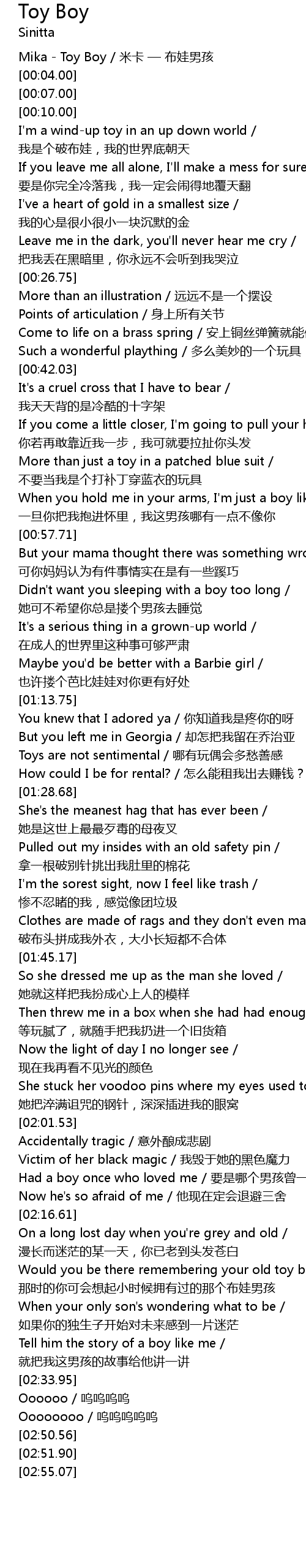 | [00:01.00] | Mika - Toy Boy / 米卡 — 布娃男孩 |