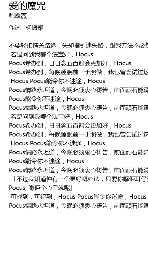 | Hocus Pocus能令你不迷途,Hocus Pocus情路永坦道,今晚必须衷心祷告,前面顽石能清扫,Hocus Pocus能令你不迷途,Hocus Pocus情路永坦道,今晚必须衷心祷告,前面顽石能清扫。 | |