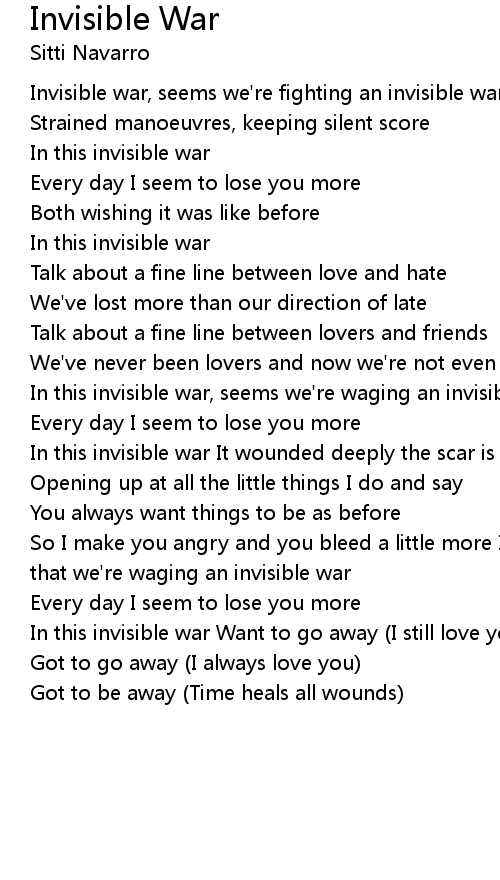 So I make you angry and you bleed a little more In this invisible war, seems that we're waging an invisible war |