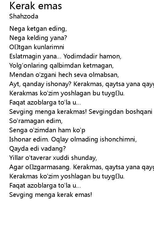 | Kerakmas ko' zim yoshlagan bu tuyg u. | |