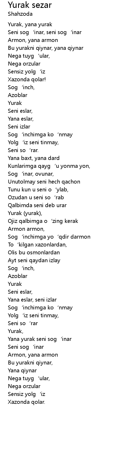 | Yana yurak seni sog' inar | |