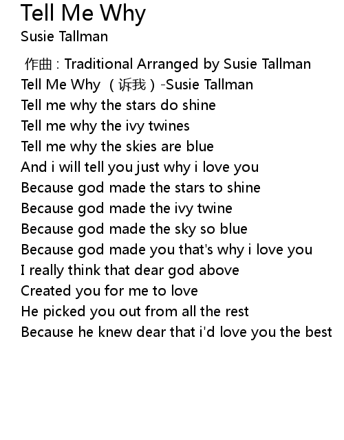 | [00:00.00] | Tell Me Why su wo Susie Tallman |