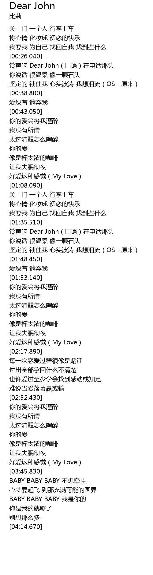 | [00:26.970] | líng shēng xiǎng Dear John kǒu yǔ zài diàn huà nà tóu |