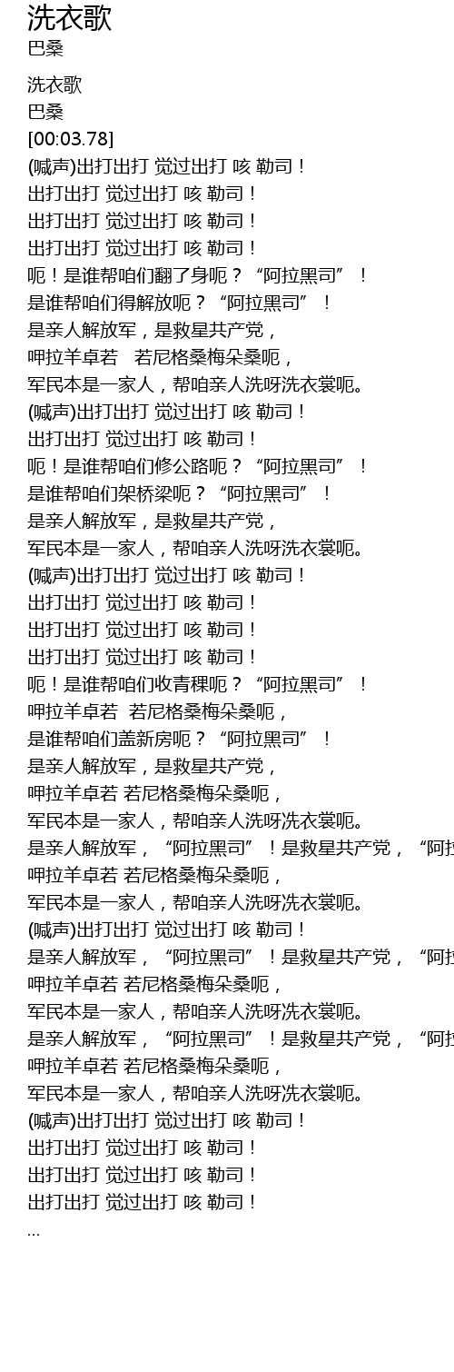| [02:33.59] | 是亲人解放军,“阿拉黑司”!是救星共产党,“阿拉黑司”! |